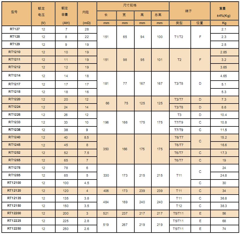 標(biāo)準(zhǔn)AGM鉛酸蓄電池RT(6GFM)系列產(chǎn)品型號